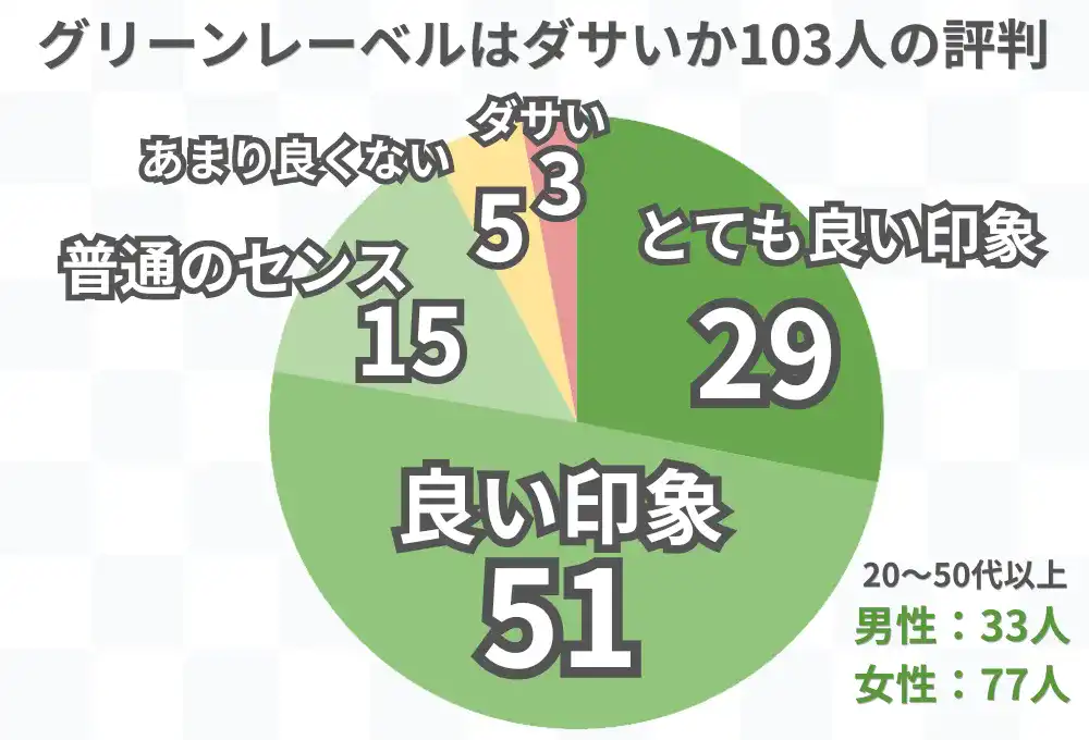 ズバリ結論から、20代~50代以上の男女103人に聞いたところ、グリーンレーベルは、ダサくないと結果は出ました